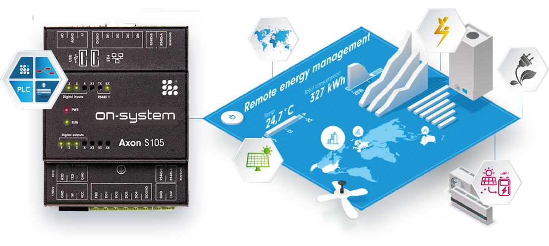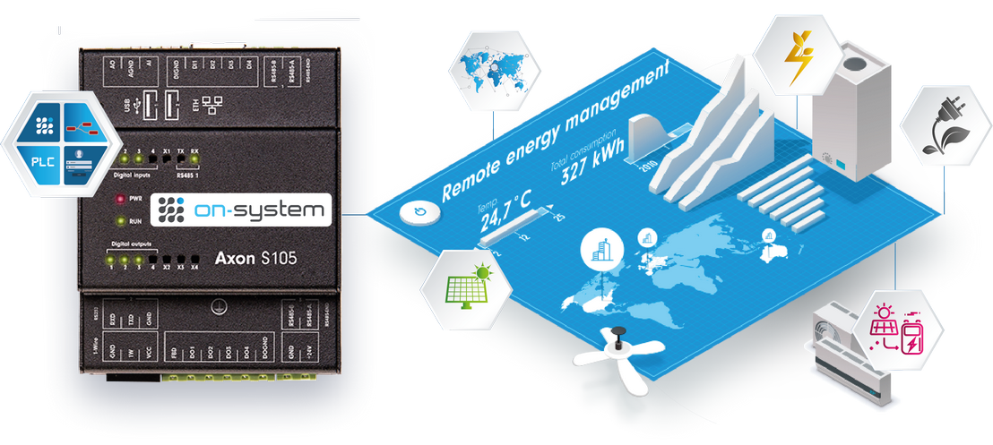 Modello On-S105 è dotato di un'architettura I / O universale che combina quattro ingressi digitali, quattro uscite digitali, un singolo I / O analogico, un'interfaccia 1-Wire singolo (fino a 15 sensori digitali) e sia la linea seriale RS485 che la linea seriale RS232 .